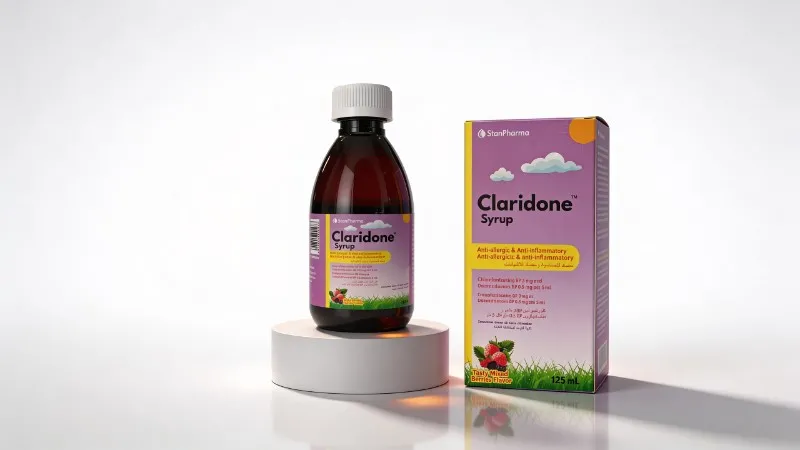 Claridone Syrup, containing dexamethasone and chlorpheniramine, is indicated for the symptomatic relief of allergic conditions such as allergic rhinitis, urticaria, skin allergies, and other hypersensitivity reactions. It helps to reduce inflammation, swelling, itching, and allergic symptoms including sneezing, runny nose, and watery eyes.