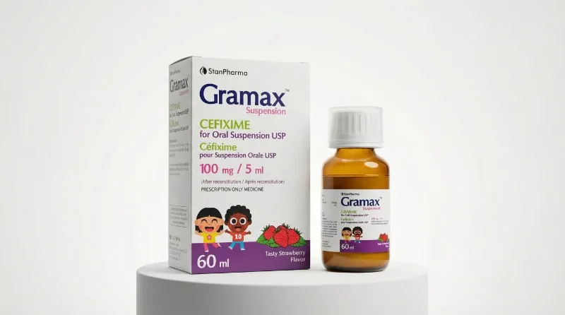 Gramax Suspension 100 mg/5 ml, containing cefixime, is indicated for the treatment of mild to moderate bacterial infections caused by susceptible organisms. It is used in the management of respiratory tract infections (such as bronchitis and pharyngitis/tonsillitis), urinary tract infections, ear infections (otitis media), and certain gastrointestinal infections including typhoid fever. The strawberry-flavoured suspension formulation improves palatability and compliance, especially in pediatric patients.