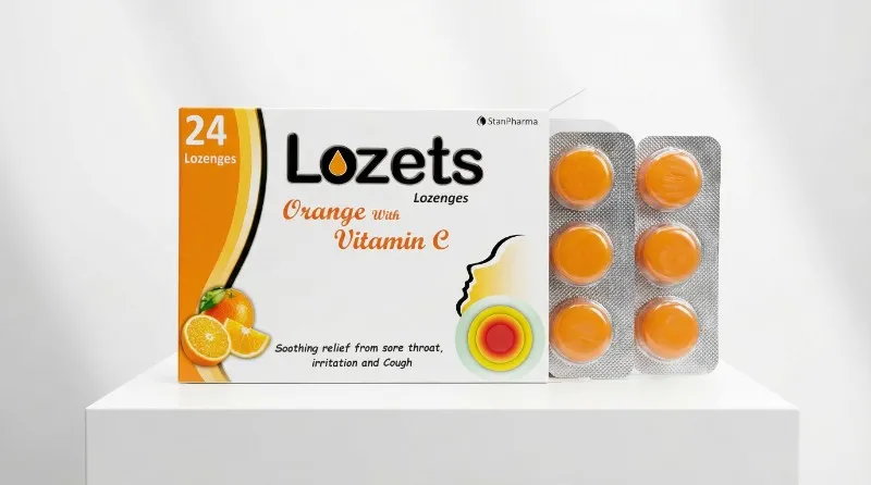 Lozets Orange is indicated for the symptomatic relief of sore throat, throat irritation, and cough, particularly those associated with the common cold. Enriched with vitamin C, it also helps to support immune function and enhance resistance to infections, while its blend of essential oils (menthol, thymol, eucalyptus oil, and clove oil) provides soothing, antimicrobial, and cooling effects for improved throat comfort.
