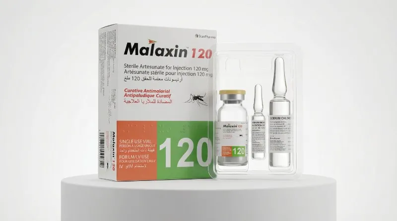 Malaxin IV Injection, containing artesunate, is indicated for the treatment of severe malaria, particularly infections caused by Plasmodium falciparum. Artesunate acts by killing malaria parasites at multiple stages of their lifecycle, leading to quick clinical improvement and reduction in mortality.
